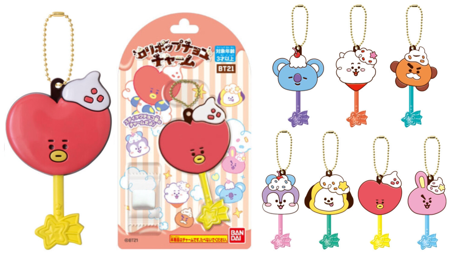 ■ BT21 ロリポップチョコチャーム ●彩色済チャーム1個(全7種) 1. KOYA 2. RJ 3. SHOOKY 4. MANG 5. CHIMMY 6. TATA 7. COOKY ●ガム(ソーダ味)1個 価格:330円(税込)