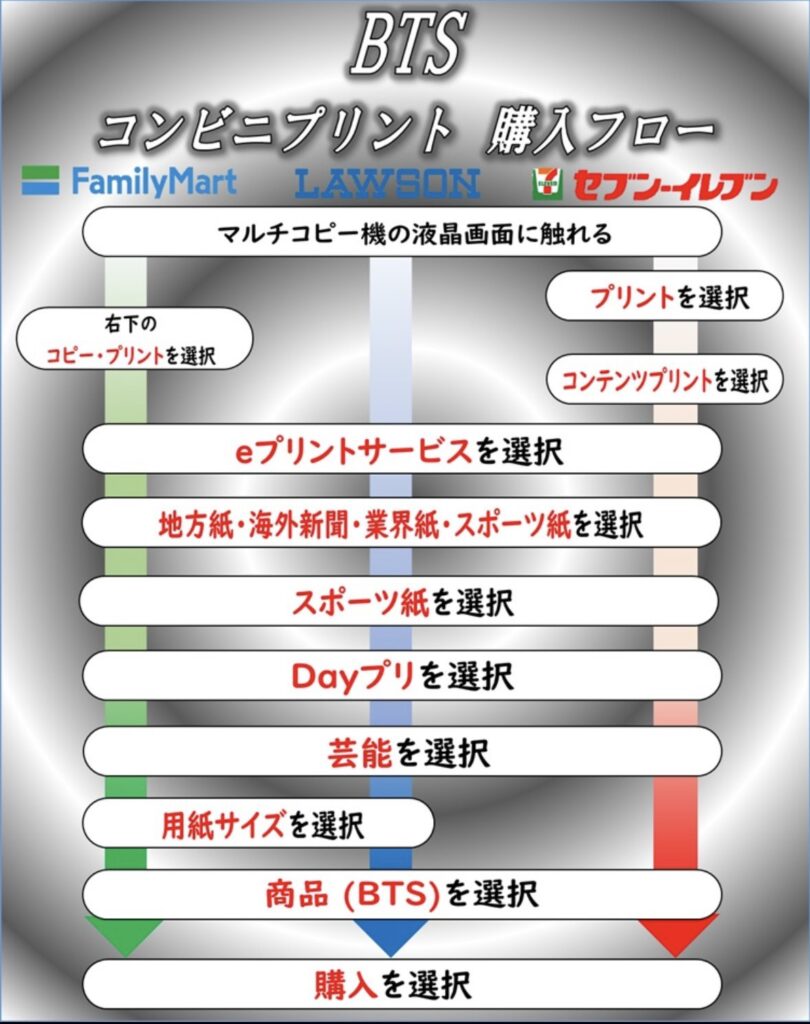 ■ コンピニプリントのやり方ガイド <セブンイレブン・ローソン・ファミリーマートなど> ① マルチコピー機の画面をタップする ② プリントを選択 *セブンイレブンの場合は、さらに「コンテンツプリント」を選択 ③ eプリントサービスを選択 ④ 地方紙・海外新聞・業界紙・スポーツ紙を選択 ⑤ スポーツ紙を選択 ⑥ Dayプリを選択 ⑦ 芸能を選択 ⑧ 用紙サイズを選択 *セブンイレブンは選択不可 ⑨ 印刷したい絵柄を選択 ⑩ 購入を選択 ※コンビニにより一部やり方が異なる場合があります。