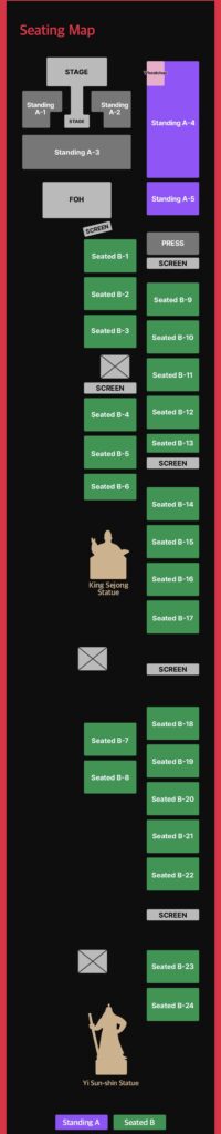 【チケットや公演演出に関する注意事項】 ● スタンディング席のA-1、A-2、A-3セクションは、Weverseの事前予約抽選の当選者のみ利用可能 ● NOLの一般チケットは、Weverseの指定エリアを除く全セクションで購入可能 ● スタンディング席の"A"は指定席ではなく、チケットに記載されている入場番号の順番に入場となる ● 番号が小さいほど早い入場となる ● すべての着席セクションは、段差や階段のない平らな地面にある ● 座席セクション"B"は、公演および撮影に必要な設備のためステージを直接観ることはできない ● 公演は会場内のLEDスクリーンで観覧可能 ● 舞台のレイアウトおよび座席表は、制作上の理由により予告なく変更となる場合がある ● 本イベントは撮影・ライブ配信が行われ、技術機器や制作設備により視界が制限される場合がある ● ご来場のお客様がカメラに映り込む、またはイベント後のコンテンツに使用される可能性がある ● お席の位置によっては、手すり、舞台構造物、カメラなどの障害物により視界が遮られる場合がある ● これらの視界障害を理由としたキャンセル、交換、返金は不可 ● 公演当日の現地でのチケット販売はなし