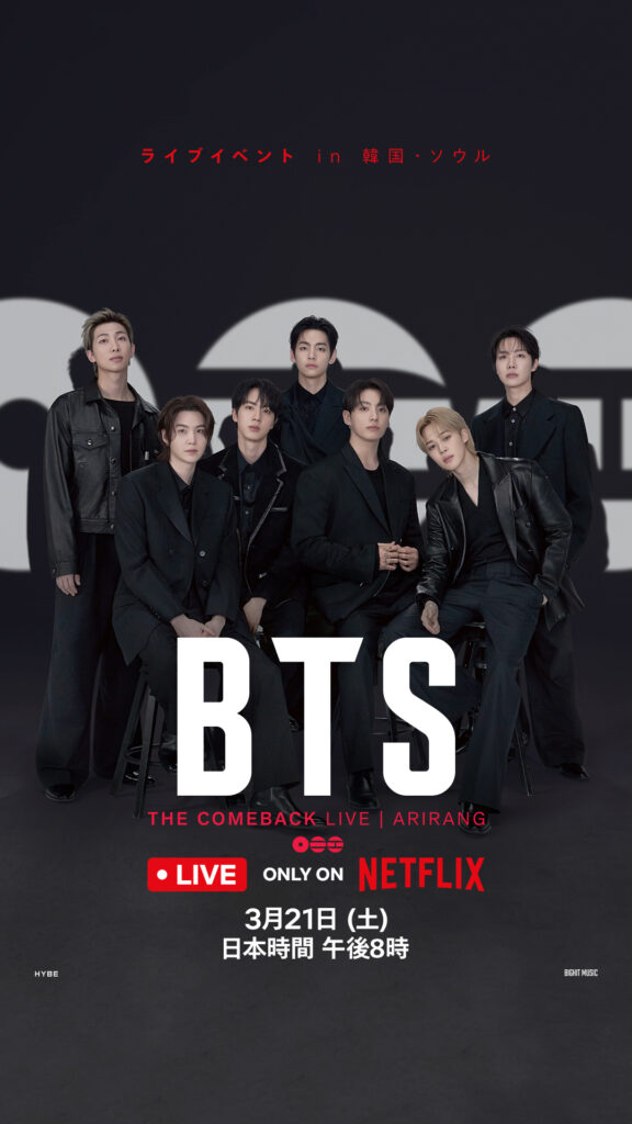 BTSのARIRANGコンサートは、HYBEとNetflix(ネットフリックス)がパートナーシップを組み、Netflixにて独占配信が行われます。