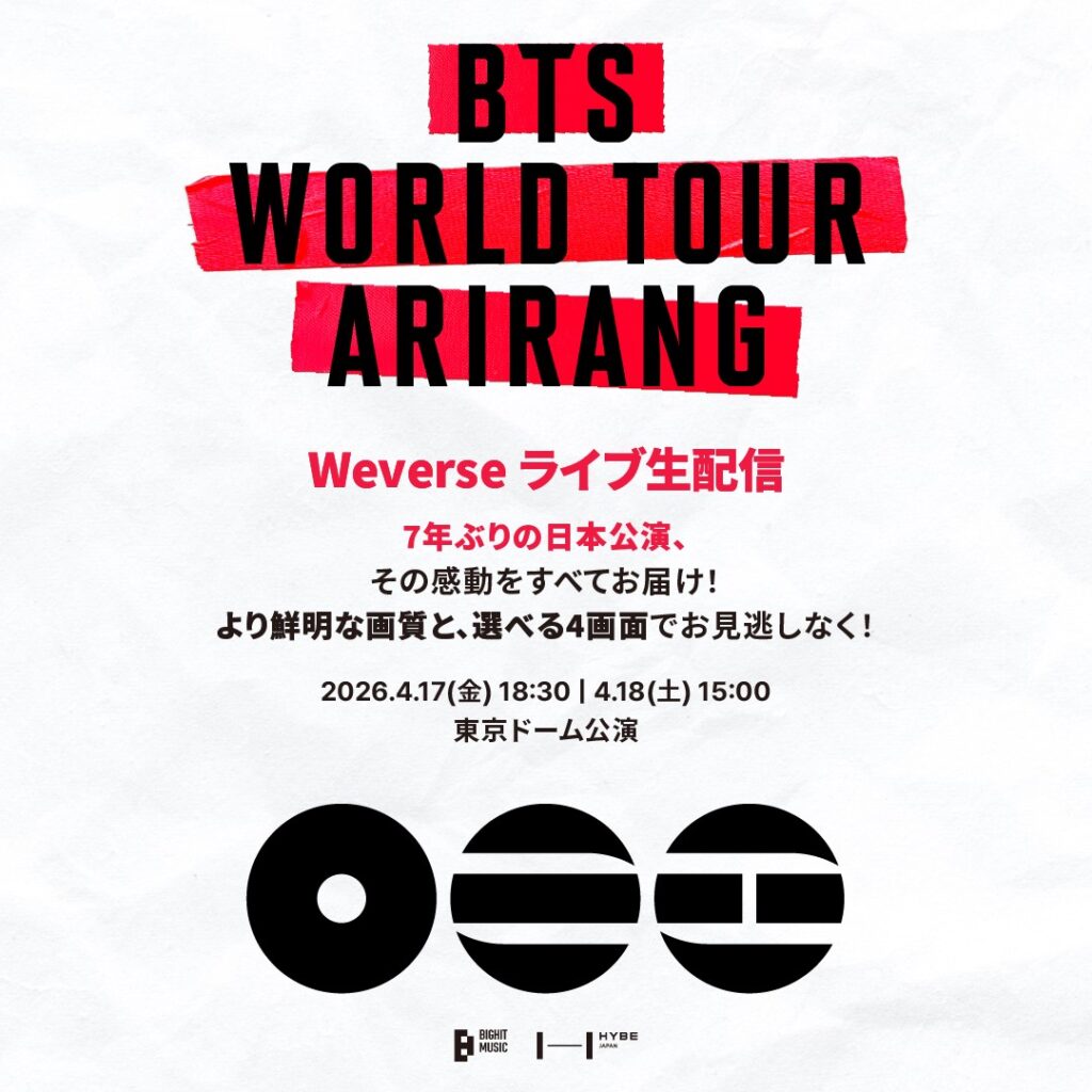 BTSの東京ドーム公演「BTS WORLD TOUR ‘ARIRANG’ IN JAPAN」のライブストリーミング(生配信)の開催が決定しました!