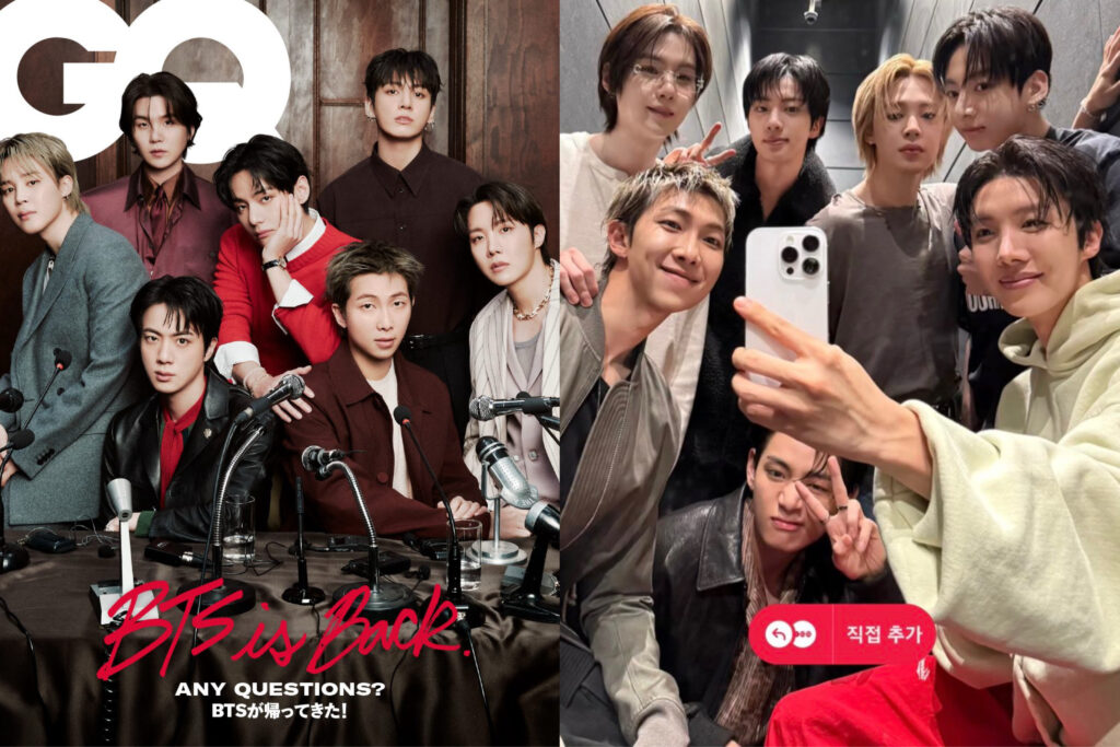 一つは約4年ぶりに7人完全体で一緒にする表紙『GQ JAPAN』2026年4月号の特別表紙版、もう一つはBTSの新カムバックプロジェクト『WHAT IS YOUR LOVE SONG?』の記念写真になります。