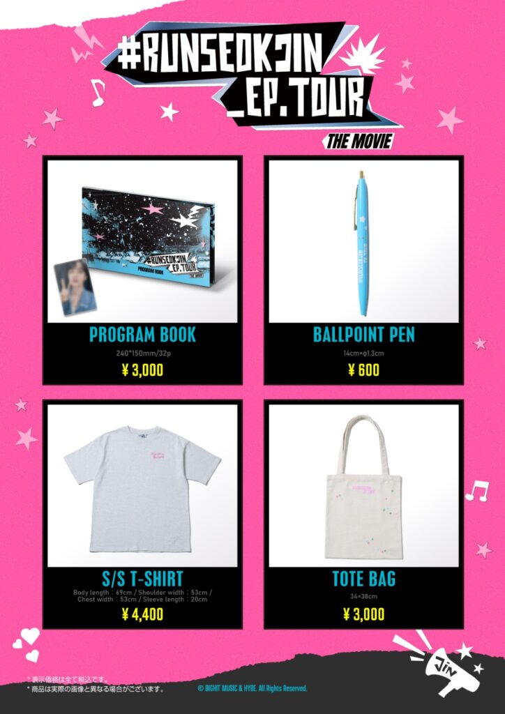 【#RUNSEOKJIN_EP.TOUR THE MOVIE OFFICIAL MERCHANDISE】 ● プログラムブック ¥3,000(税込) ● ボールペン ¥600(税込) ● S/S Tシャツ ¥4,400(税込) ● トートバッグ ¥3,000(税込) <劇場限定販売商品> ● オリジナルポップコーンバッグ(全1種) ¥1,500円(税込) 購入者特典:チェキ風フォトカード(2種ランダム) ※お一人様1会計につき、商品各5個まで ※プログラムブックは除く